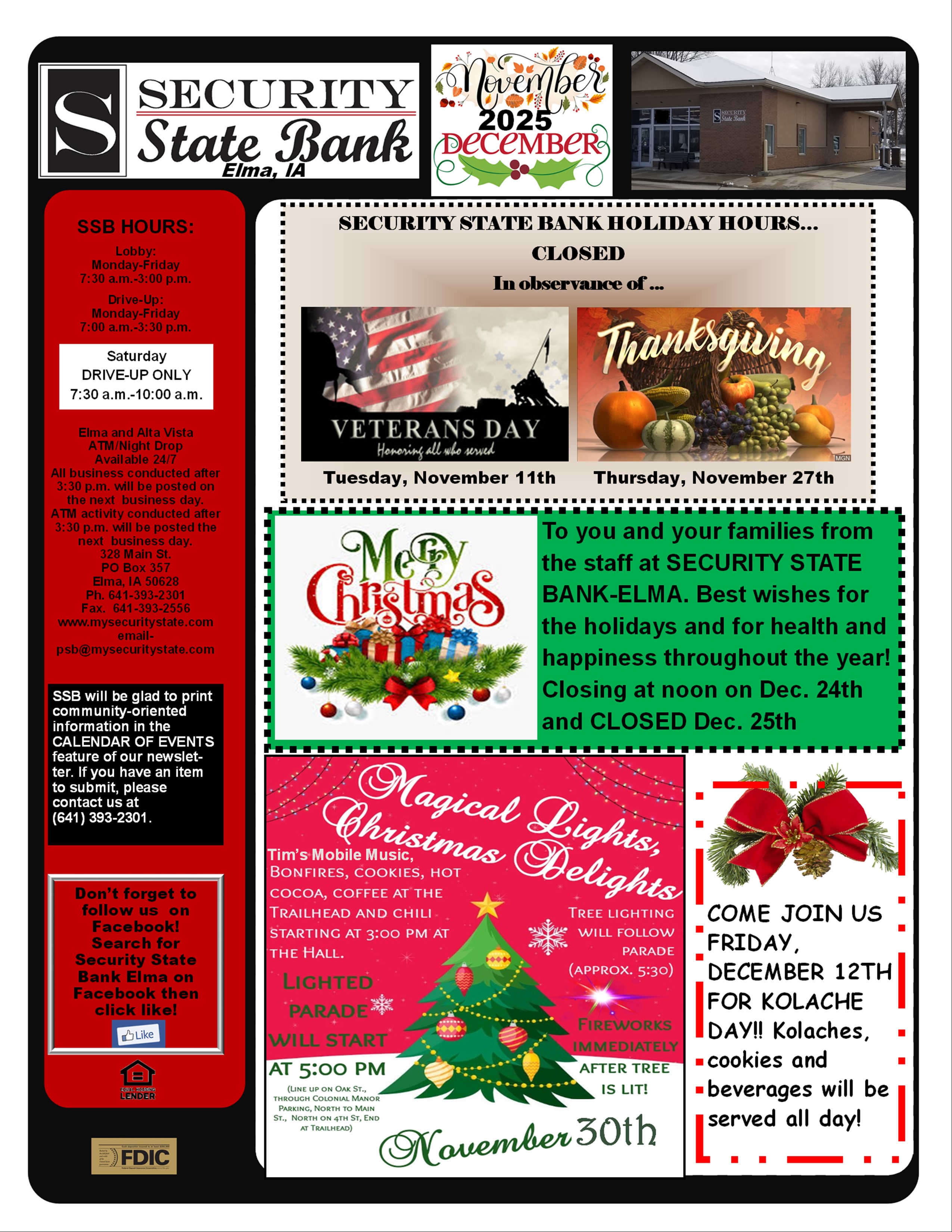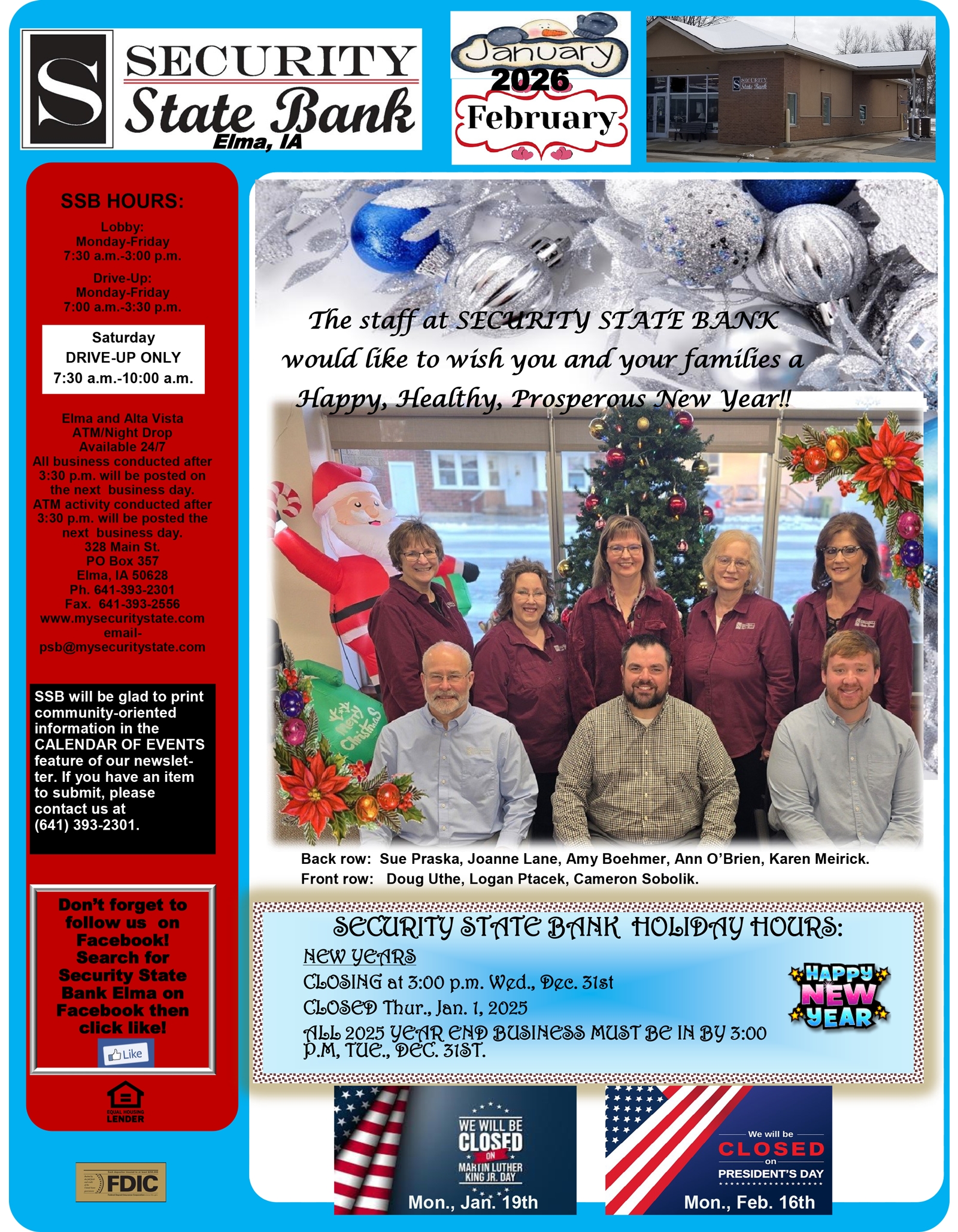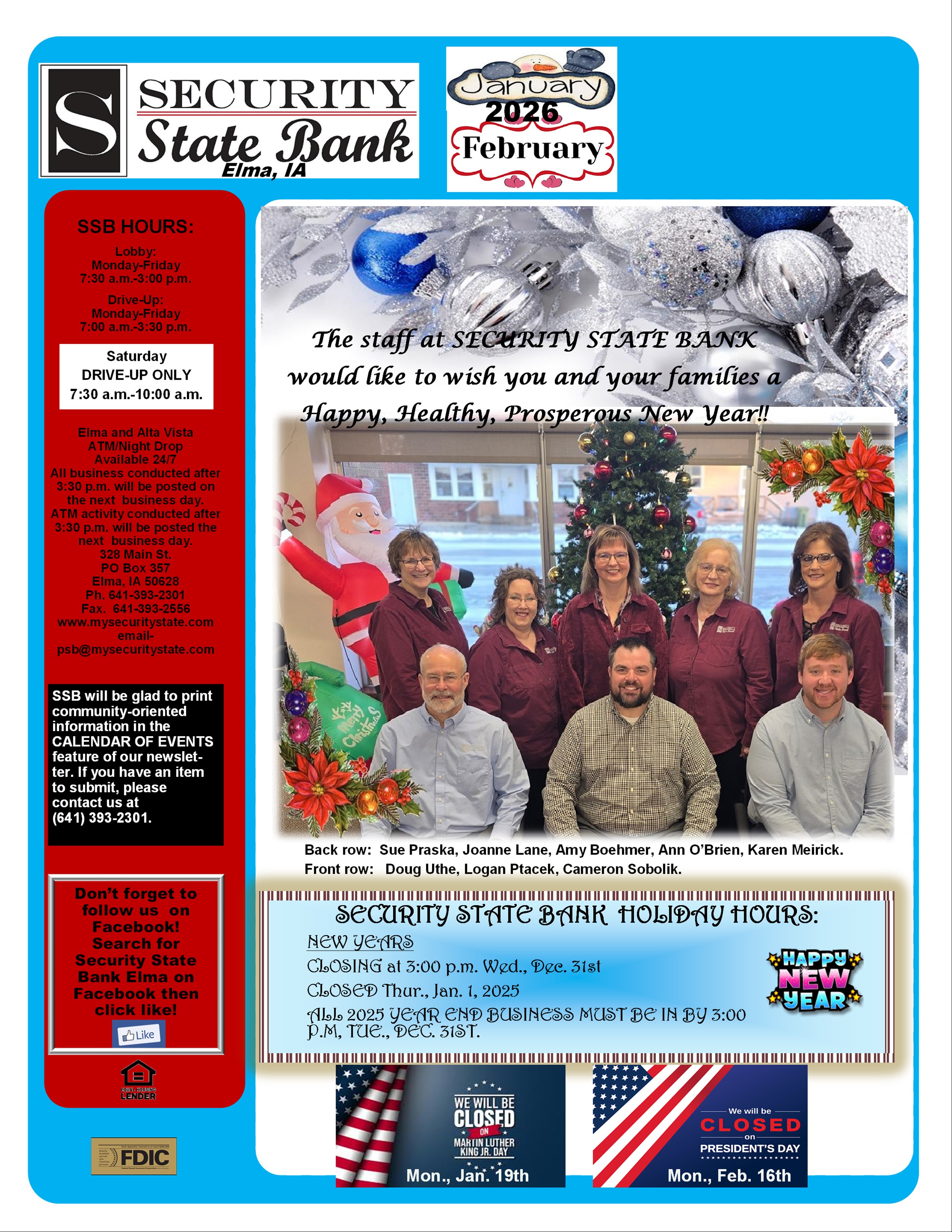 Every other month we send out a newsletter that includes information on our services, details of upcoming banking events and community events and an update on ag markets and more. If you would like us to e-mail you the newsletter each time, complete the Contact Us form on the website.